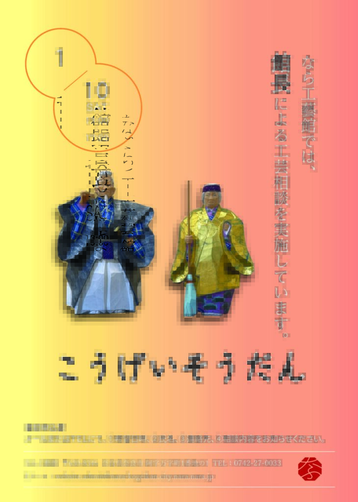2025年12月9日 / Last updated : 2025年12月9日 shopro 事務局 2026年1月10日(土)館長による工芸相談を実施します なら工藝館では、館長による工芸相談を実施しています。 ①希望日時、②氏名、③連絡先、④相談内容をご記入の上、 メールまたはTELにて事前にお申込みください。 実施日時:2026年1月10日(土) 13~17時 MAIL:website.admin@nara-kogeikan.city.nara.nara.jp TEL:0742-27-0033